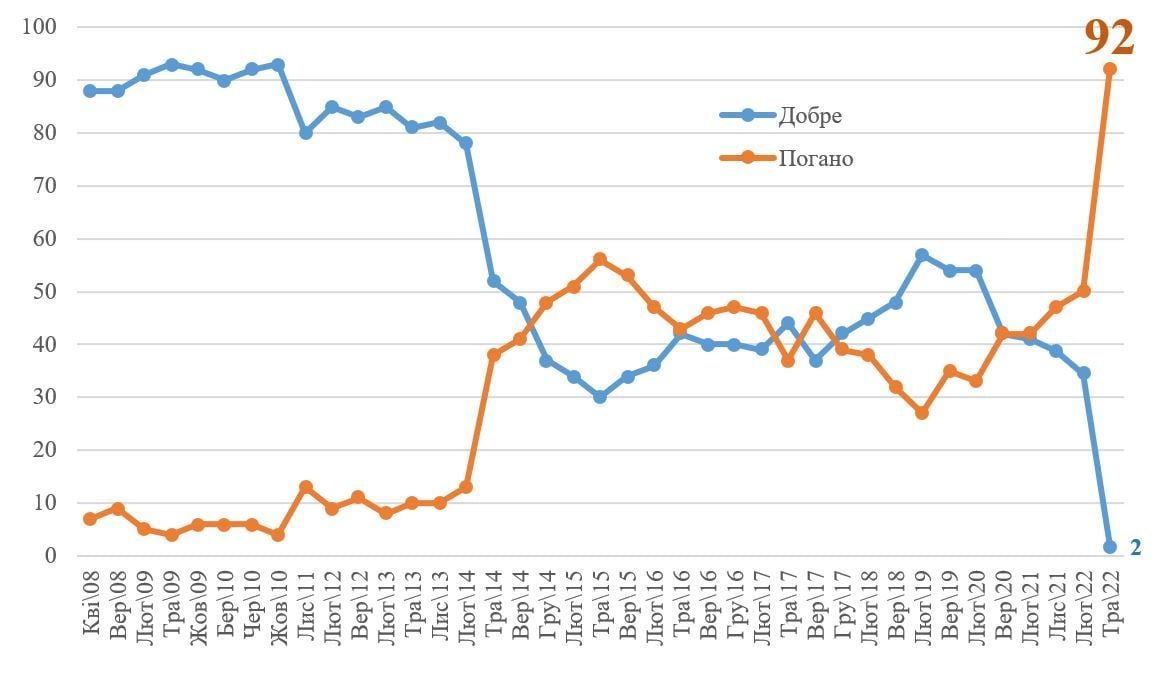 Проте зараз позитивне ставлення до росіян залишилося лише у 2% населення України. 92% ставляться погано.