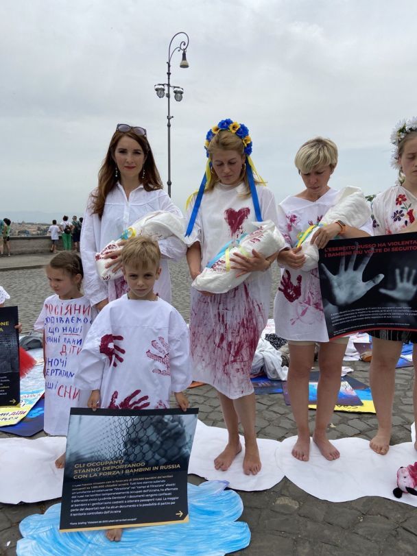 На площі Piazza Garibaldi у Римі дівчата з руху Марш матерів представили перфоманс для місцевих мешканців та туристів – мовчазну живу інсталяцію у вигляді закривавлених привидів жінок і дітей в пам'ять про постраждалих, зґвалтованих та померлих дітей України. До руху також приєдналися співробітники Посольства України в Італії.