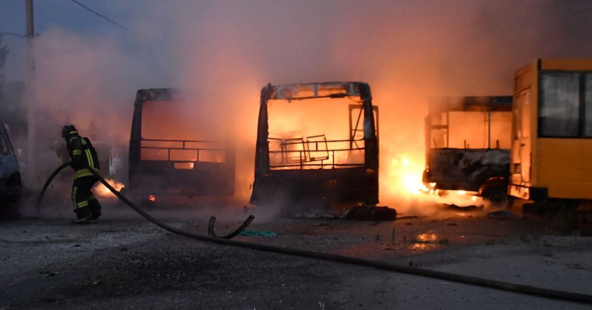Російські окупанти вкотре обстріляли Херсон. Загорілися щонайменше 10 маршрутних автобусів.