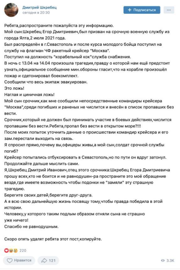 Користувачі соцмережі "ВКонтакте" розповідають ро своїх родичів, яким не вдалося вижити на крейсері "Москва". Як пише Meduza, житель окупованої Ялти Дмитро Шкребець 17 квітня повідомив, що його син Єгор проходив строкову службу на крейсері "Москва". Шкребець уточнив, що після загибелі корабля його сина, за словами офіцерів, внесли до списків зниклих безвісти.
