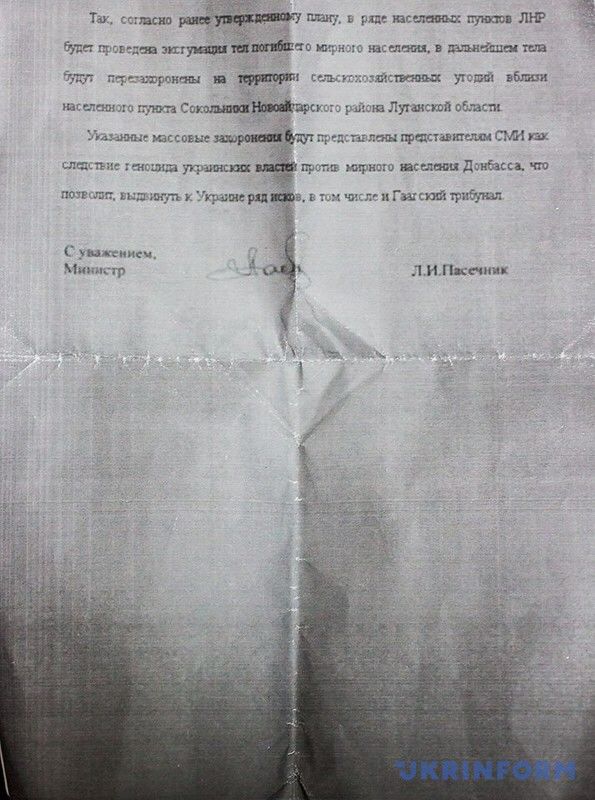 "Вказані масові захоронення будуть представлені представникам ЗМІ як наслідок геноциду української влади проти мирного населення Донбасу, що дозволить заявити до України низку позовів, у тому числі в Гаазький трибунал", - пише "міністр" у листі до Плотницького.
