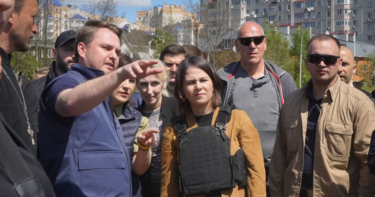 У вівторок, 10 травня, очільниця німецького МЗС приїхала до України та відвідала звільнене місто Буча на Київщині, де також поспілкувалася з місцевими жителями.