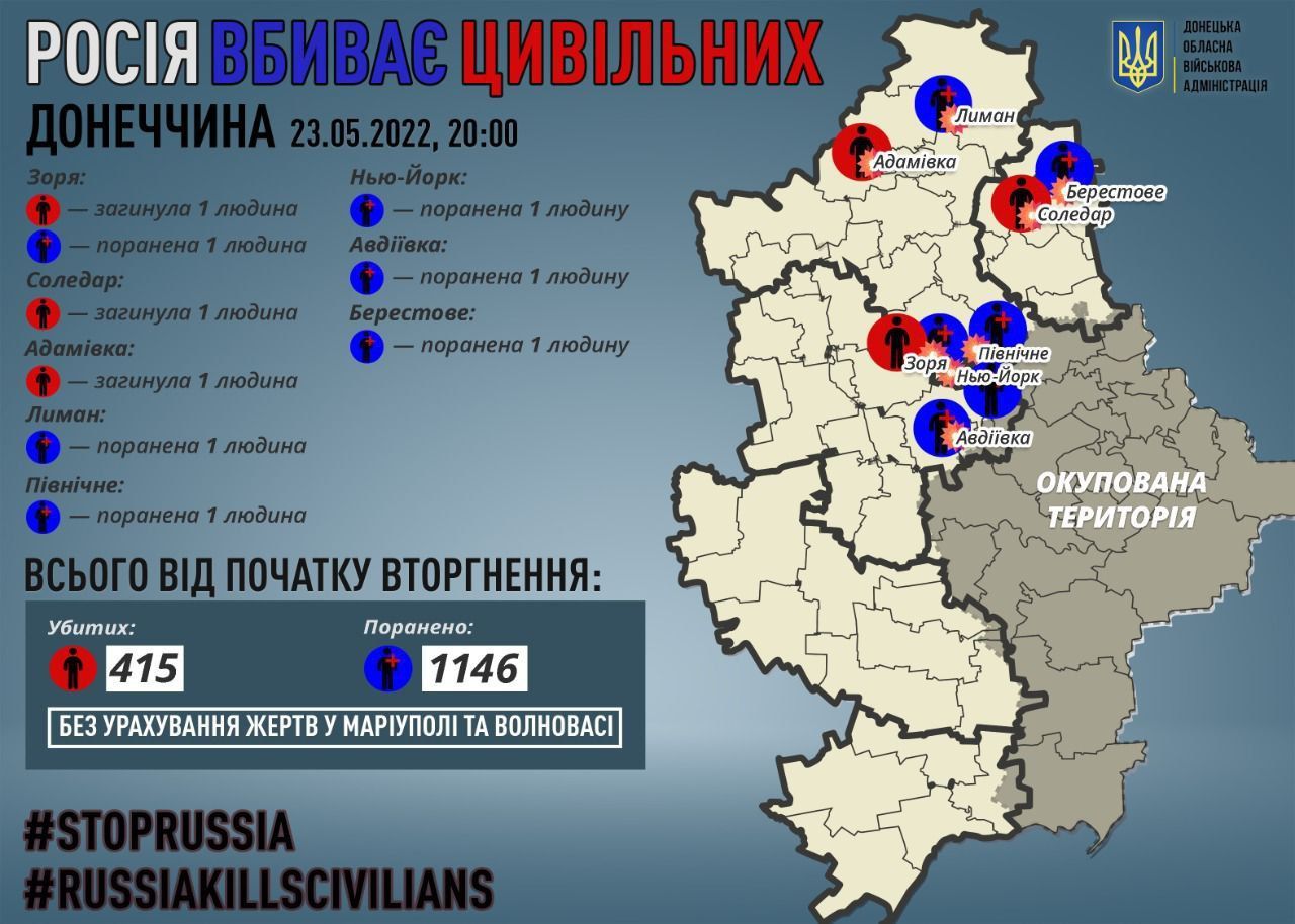 Зазначимо, через російську агресію на Донеччині загинуло 415 цивільних, 1146 – зазнало поранень (без урахування жертв у Маріуполі та Волновасі).