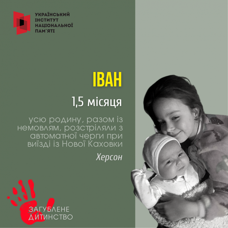 Але 24 лютого, коли родина рятувалась із Нової Каховки та шукала прихистку, російські вбивці пустили кулю в півторамісячне дитя, яке плакало від страху. Перед тим, як вбити Іванка, вони розстріляли всю його родину, що була в одному автомобілі, – маму, бабусю з дідусем та сестричку Софійку.