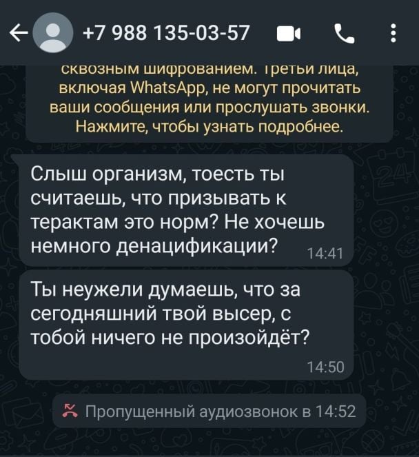 Погрози надходять з номерів різних російських операторів у приватні повідомлення в соціальних мережах Telegram та WhatsApp.