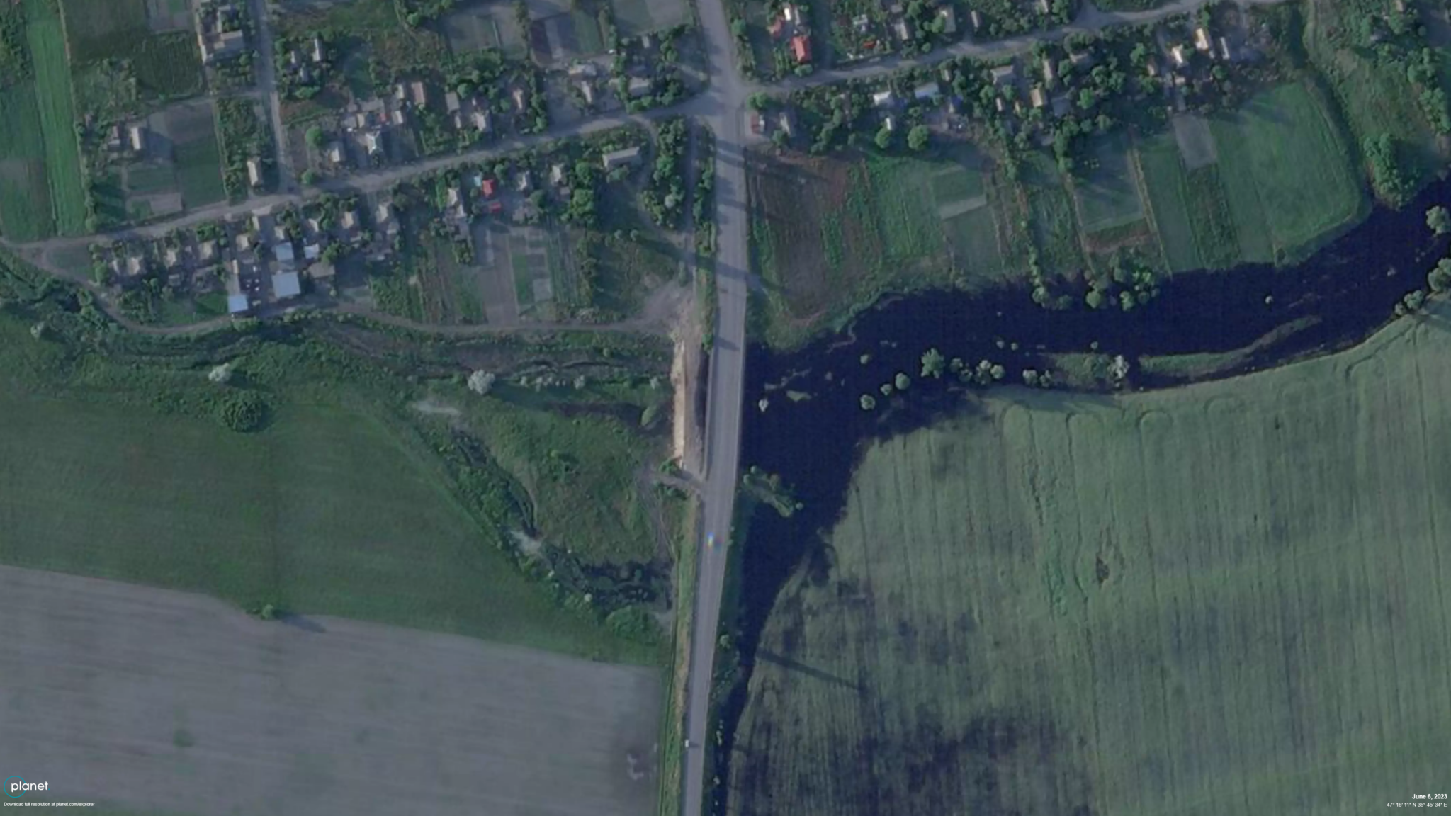 Супутникові знімки за 6 червня свідчать, що загарбники збудували схожу на піщаний бар'єр греблю на річці Токмачка в межах лінії своєї оборони. Аналітики з посиланням на сліди шин припускають, що росіяни використовують греблю як додатковий міст, хоча поруч розташована дорога P37, яка функціонує