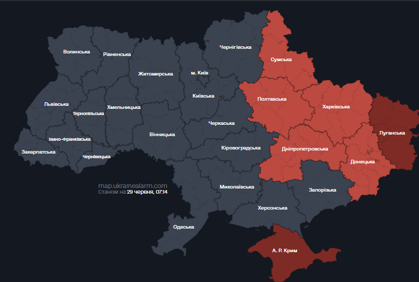 Карта тривог станом на 07:13 29 червня