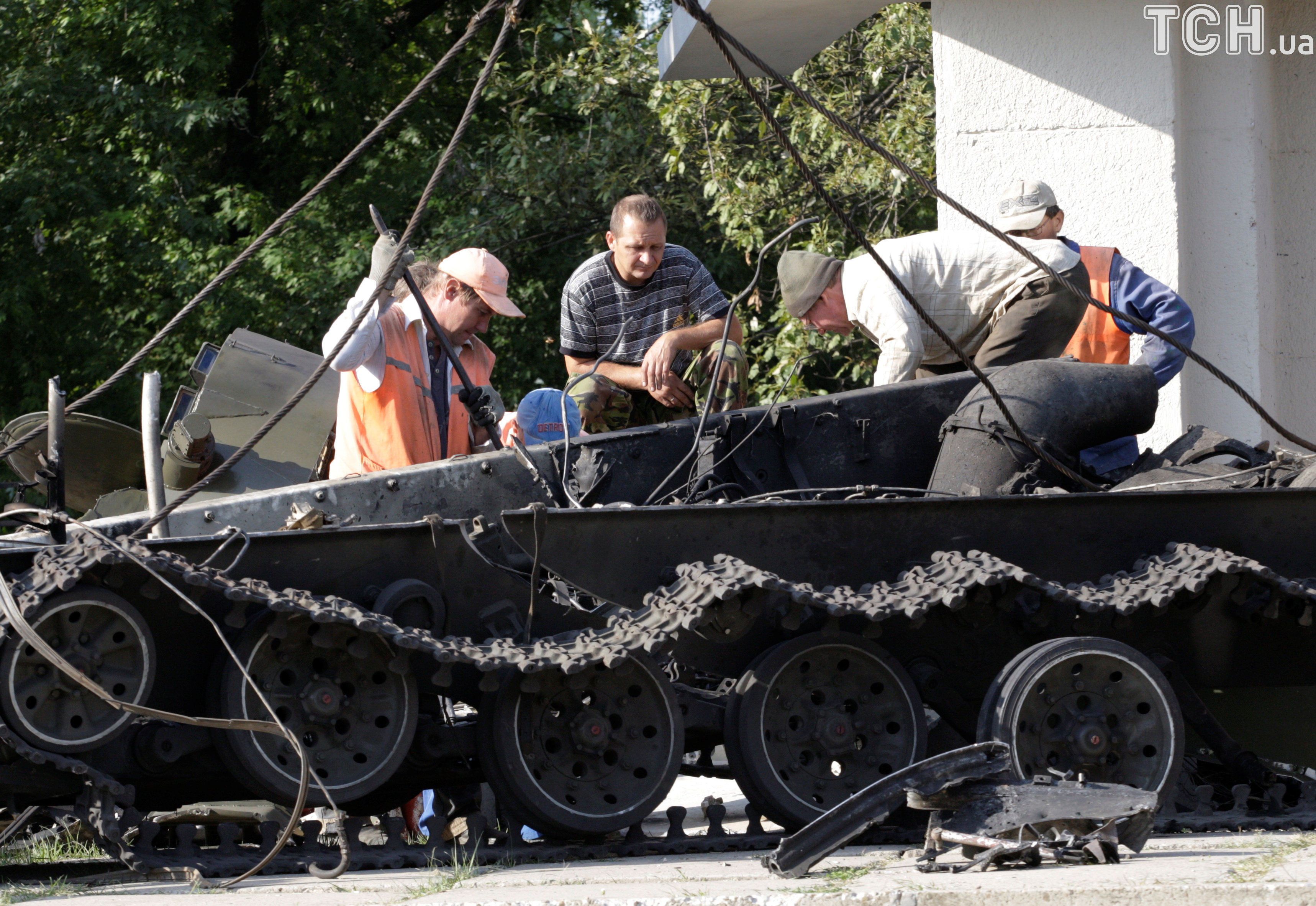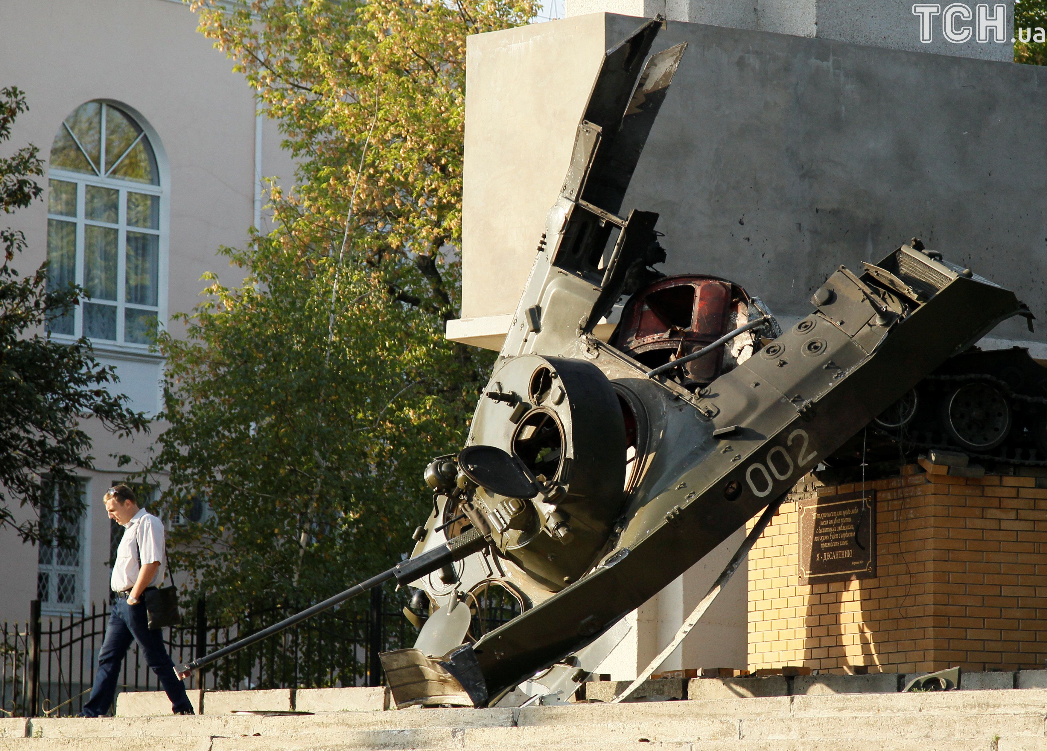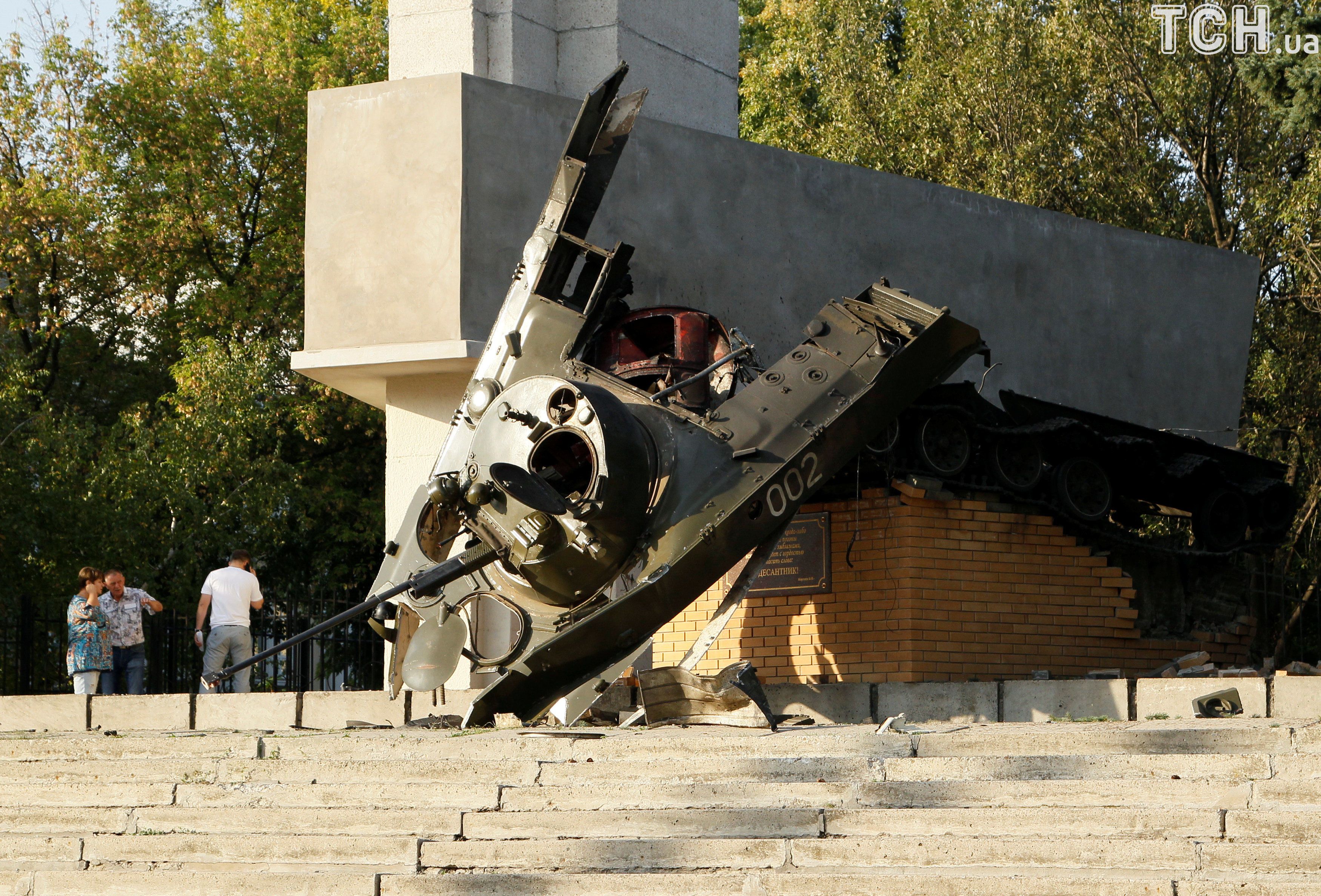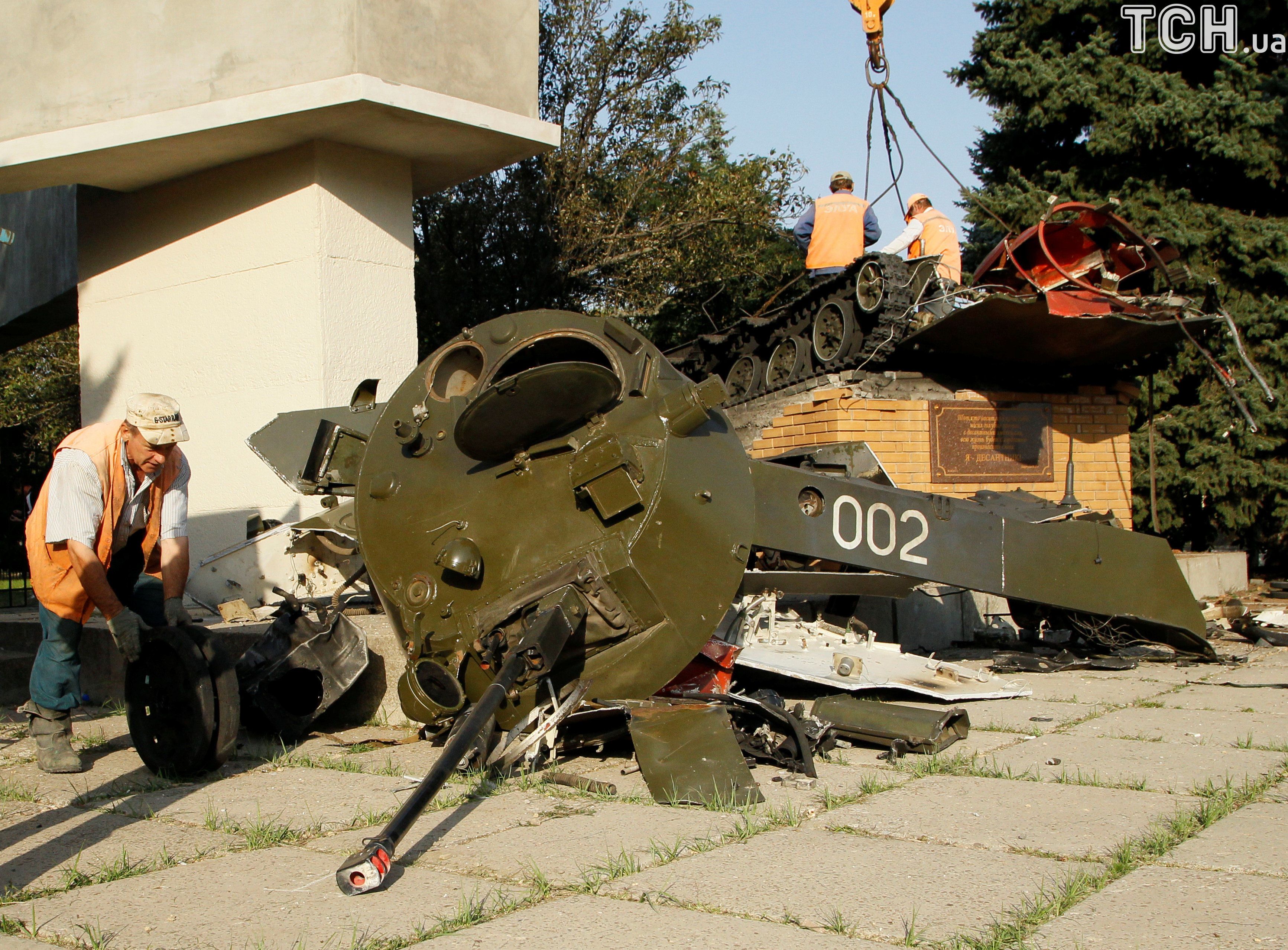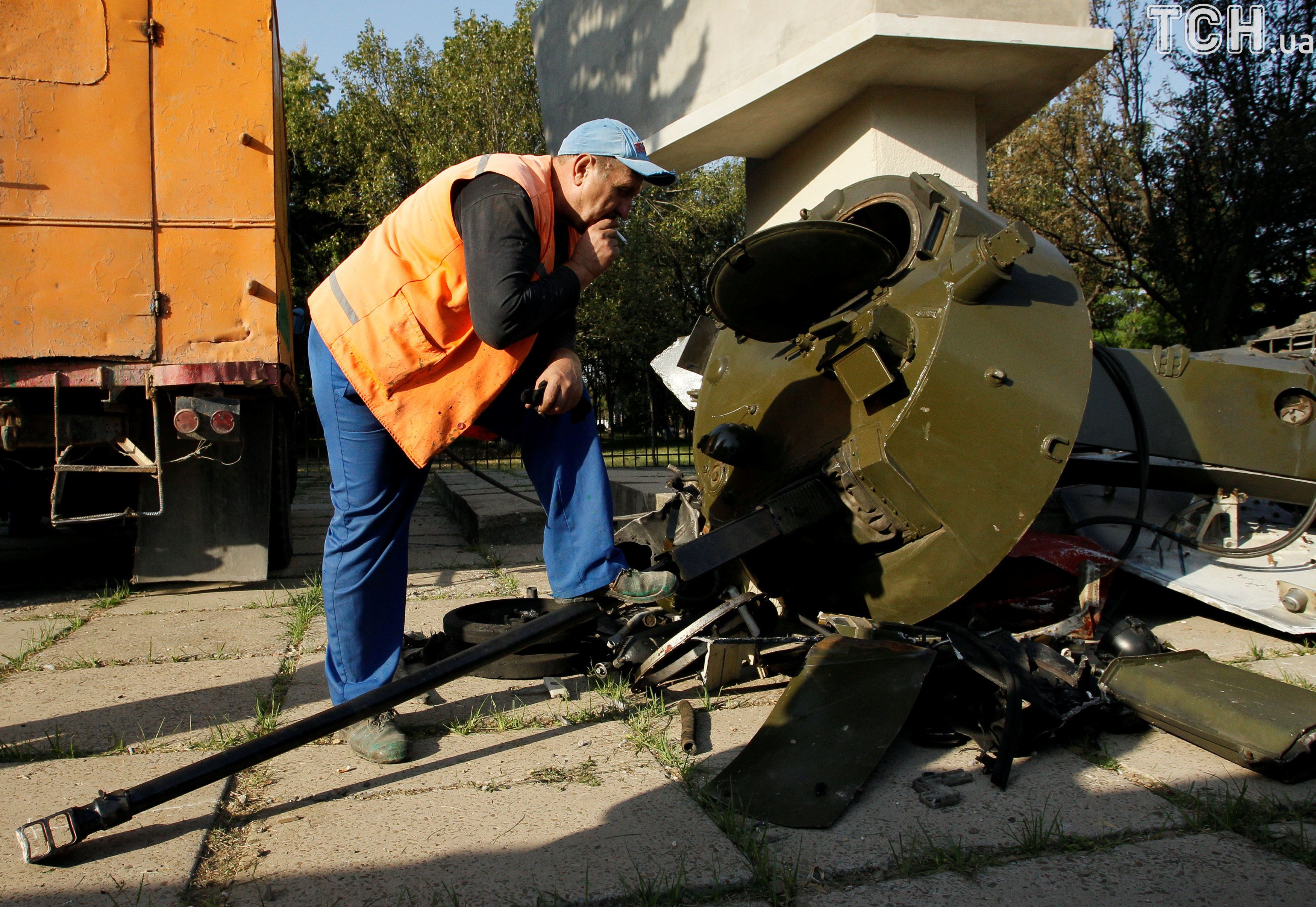 Працівники знімають пошкоджений бортовий штурмовик, пам'ятник загиблим десантникам "ЛНР". / © Reuters