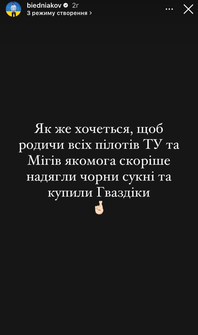 "Як же хочеться, щоб родичі всіх пілотів Ту та МіГ якомога скоріше одягнули чорні сукні та купили гвоздики", - зазначив шоумен.