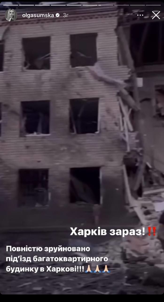 "Харків зараз! Повністю зруйновано під'їзд багатоквартирного будинку в Харкові…Ось Київ зранку після жахливої атаки…", - обурилася Сумська.