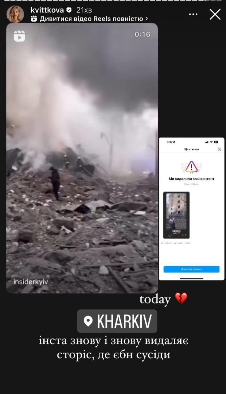 Блогерка показала наслідки ворожого обстрілу. Щоправда, Даша обурилася, що Instagram видалив її допис за порушення правил спільноти.