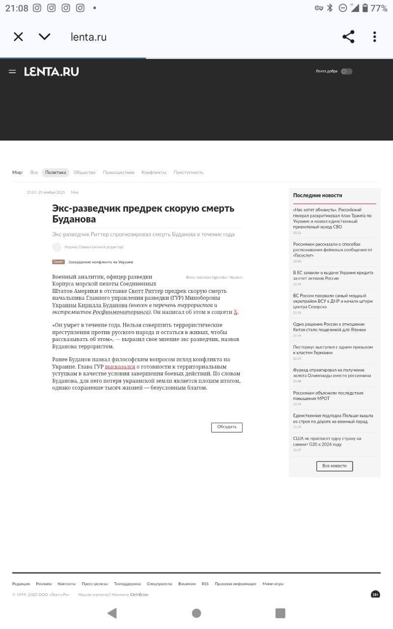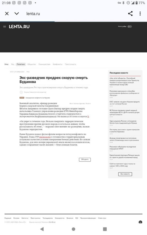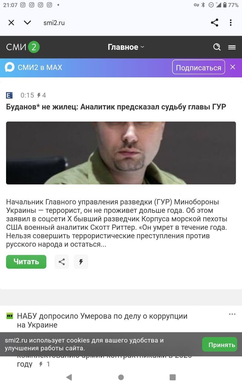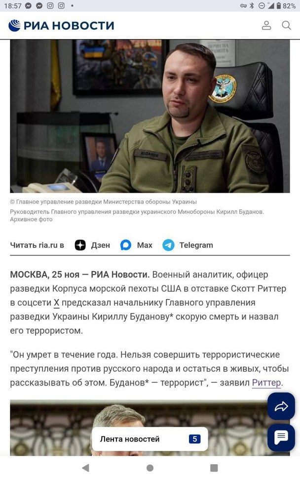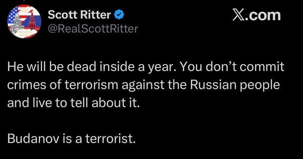 “А ось це вже серйозні Заяви. Друзі, тут російська пропаганда погрожує Буданову вбивством на тлі переговорів в Абу-Дабі. Є такий собі Скотт Ріттер. В Україні його ім’я практично нікому Невідоме. А от в мацкві він доволі популярний "Експерт", якого люблять цитувати на центральних Телеканалах. Так ось, 25 листопада він відзначився черговим скандальним твітом, який активно розтиражували найбільші російські офіційні ЗМІ: "Він помре протягом Року. Не можна вчинити терористичні злочини проти російського народу і залишитися живими, щоб розповідати про Це. Буданов - Терорист"”, - процитував ворожого пропагандиста Шнайдер.