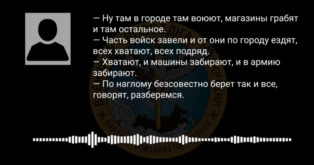 Також українська розвідка перехопила записи телефонних розмов місцевих жителів. У них йдеться про те, що російські окупанти грабують магазини, забирають в людей автомобілі та примусово мобілізують. Через це жителі ОРДЛО переховуються. Місцеві у телефонних розмовах невдоволені діями російських окупаційних військ.