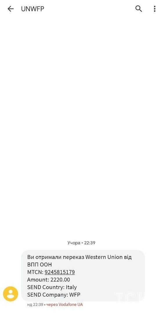 Саме тому внутрішньо переміщеним особам, які не подавали окрему заявку на отримання фінансової допомоги, але були оформлені в ЦНАПі як ВПО, почали масово приходити СМС-повідомлення від WFP Ukraine з номером переказу для Western Union.