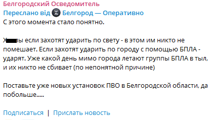 Гауляйтер Бєлгородської області Гладков підтвердив, що місто зазнало ракетного удару. Водночас місцеві пабліки, крім ракетної небезпеки, повідомляли про атаку дронів.