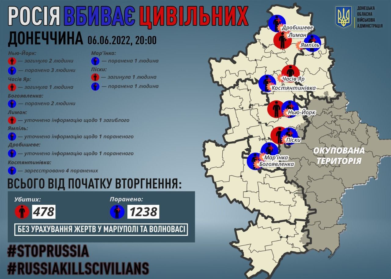 Зазначимо, через російську агресію на Донеччині загинуло 478 цивільних, 1238 – зазнало поранень (без урахування жертв у Маріуполі та Волновасі).