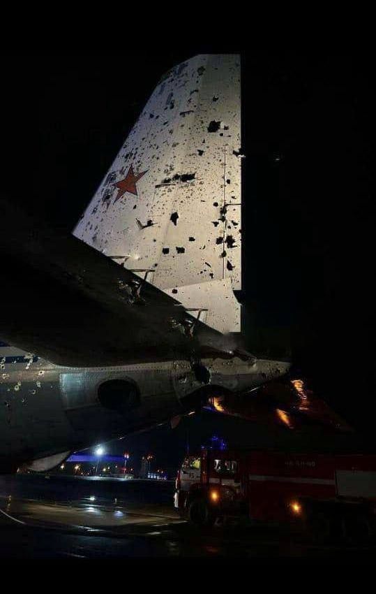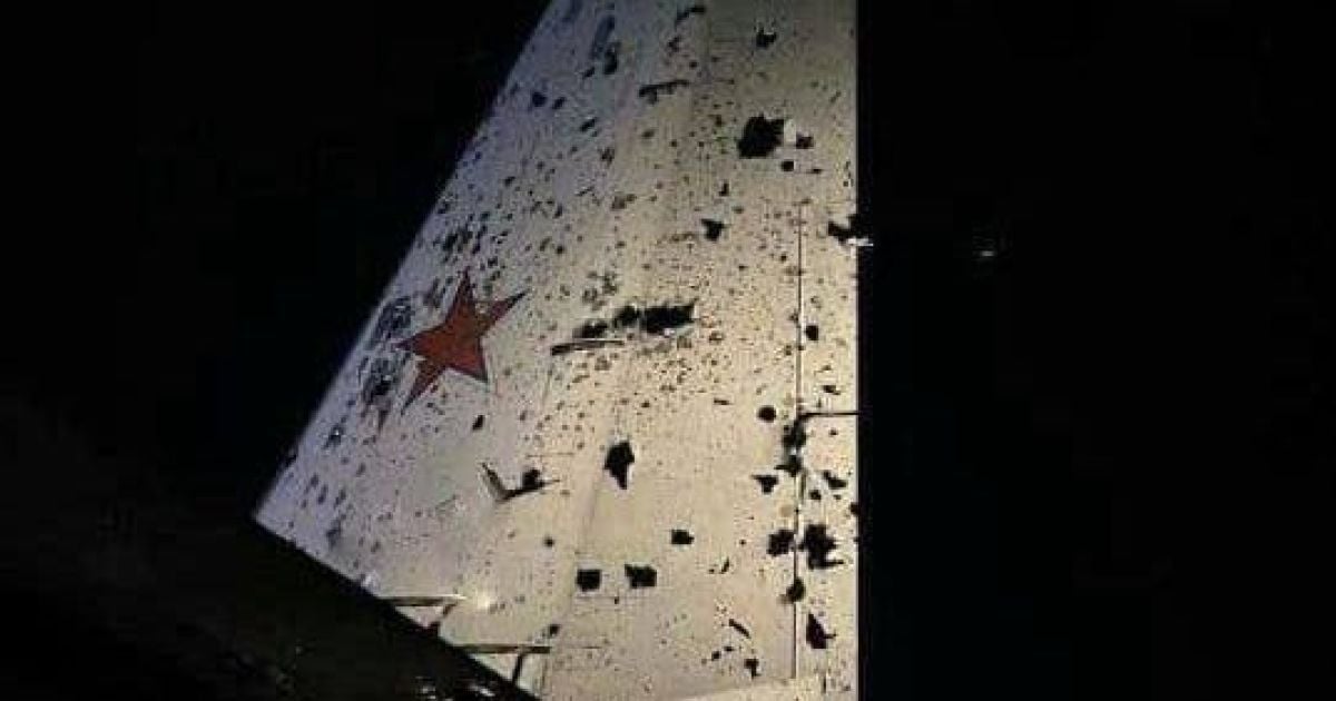 На фото видно, що російський літак, ймовірно зазнав уламкових ушкоджень.