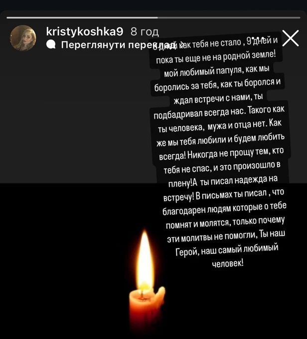 "Здається, що 2 різні людини, але на жаль ні. Це моя рідна людина, мій тато, який рік перебуває в полоні! За що? За те, що він захищав своє місто Маріуполь, свою країну, і був на своїй території? За що такі знущання? Важко дивитися на людину, яка колись була щаслива, у якої було все, а зараз просто безпорадність та порожнеча в очах. Поверніть усіх захисників Маріуполя додому, бо вони виконали свій обовʼязок перед країною", – писала тоді Крістіна.
