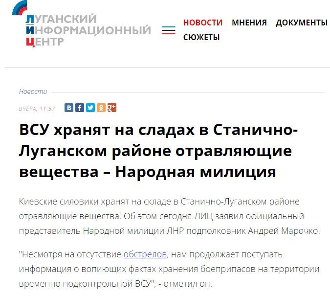 У СЦКК зазначили, що 17 квітня, на сайті "Луганский информационный центр" було опубліковано матеріал із заявою представника так званої Народної міліції ОРЛО полковника Андрія Морочка під назвою "ВСУ хранят на складах в Станично-Луганском районе отравляющие вещества — Народная милиция".