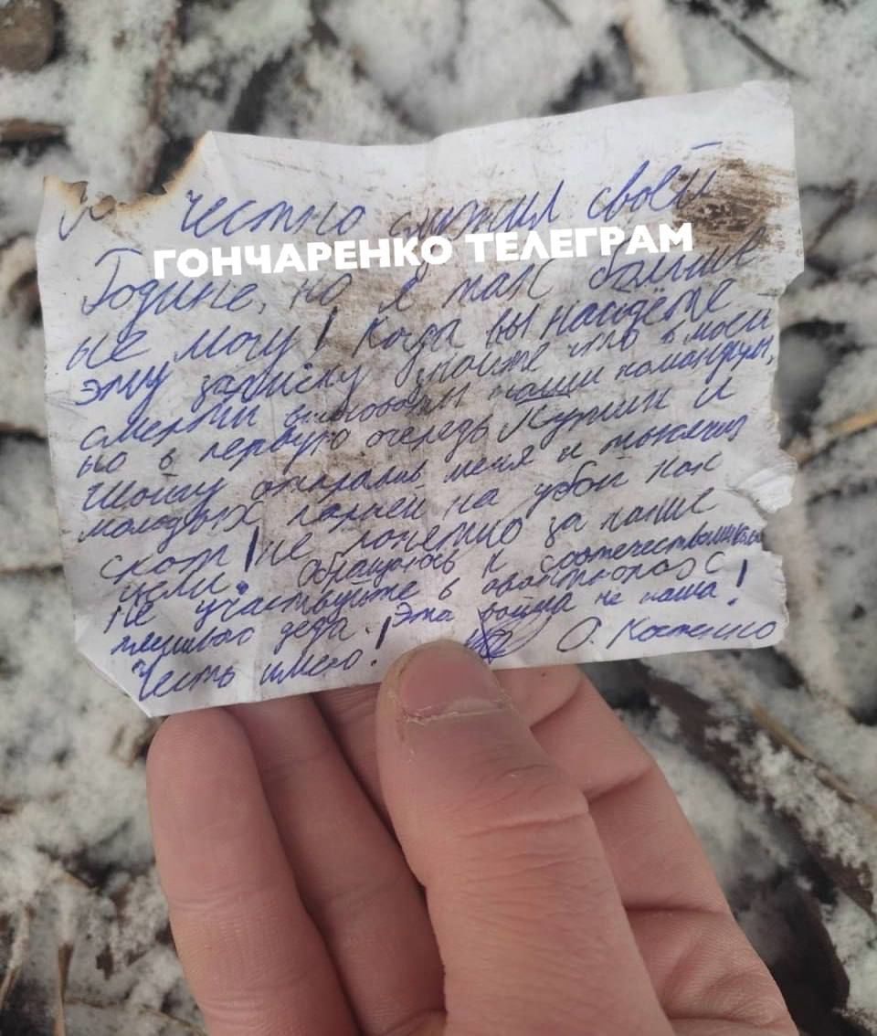 "Коли ви знайдете цю записку, знайте, що в моїй смерті винні наші командири, але в першу чергу Путін і Шойгу, відправивши мене і тисячі молодих хлопців на забій як худобу!", – йдеться у записці.