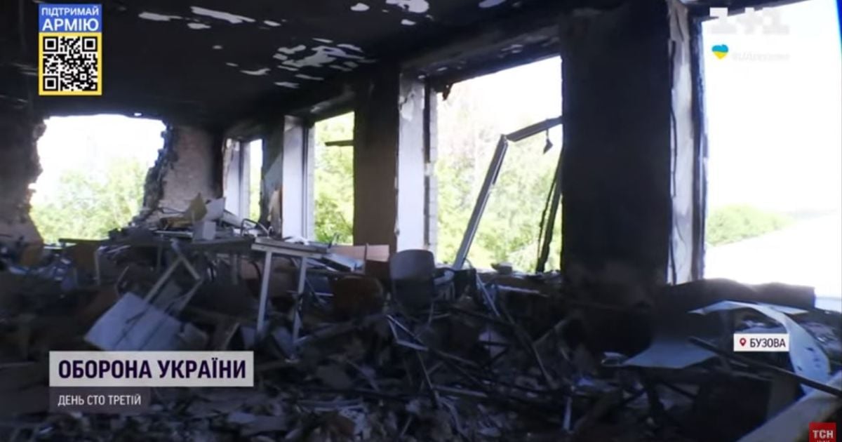 ТСН була тут одразу, як окупантів вибили з Київщини. На подвір’ї ще стирчали хвостовики ракет, в навчальних класах був гармидер від прильотів. А вже за місяць вчителі і всі працівники закладу де могли, поприбирали аудиторії від сміття, все непошкоджене начиння склали до коробок, а вікна закрили плівкою. Кажуть, що вивезли 12 вантажівок зі сміттям.