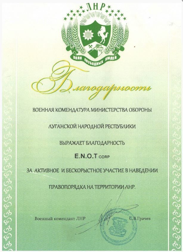 Окрім "Вагнера", на Донбасі діяло й інші угрупування приватних військових найманців - "E.N.O.T. Corp". На сайті цієї "організації" вказано, що вона нібито займається військово-патріотичної роботою і збором допомоги для "Новоросії". Однак матеріали у ЗМІ свідчать про причетність "єнотів" до військових операцій в зоні АТО – зачистки бойовиків в Антрациті, бойових дій на боці терористів, у супроводі "гуманітарних" конвоїв. За повідомленням розслідувачів, з діяльністю цього угруповання пов'язаний ідеолог "русского мира" Олександр Бородай. У відкритих джерелах є і грамоти "E.N.O.T. Corp", отримані від "військового коменданта ЛНР".