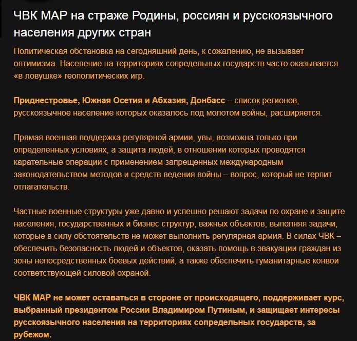 Вказується, що члени "МАР" йдуть курсом президента РФ Володимир Путіна із "захисту російськомовних", а у звітах про їхню діяльність написано, що вони займаються доправкою на Донбас гуманітарної допомоги, а також беруть участь у бойових діях. Зокрема в статті ПВК "МАР" на передовій, розміщеної ще в червні 2015 року викладені фотографії співробітників ПВК зі зброєю і в окопах.