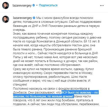 Днями російський артист написав, що активно допомагає біженцям з "Л/ДНР" і розповів історію 13-річної дівчини з міста Ясинувата Донецької області. За словами Лазарєва, на початку травня "нацисти під час обстрілу дому Насті її поранили" і наразі вона перебуває в лікарні "ДНР". Окрім того він заявив, що постійно на зв'язку з волонтерами з Донбасу, які йому розповідають, що "ЗСУ б'ють по живому – по школах, лікарнях, житлових будинках!".