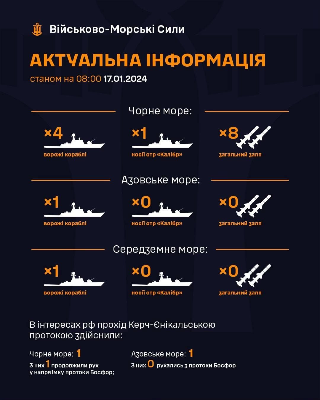 Станом на 08:00 середи, 17 січня, у Чорному морі перебувають чотири російські кораблі, серед яких один – носій крилатих ракет "Калібр". Загальний залп – до восьми ракет.