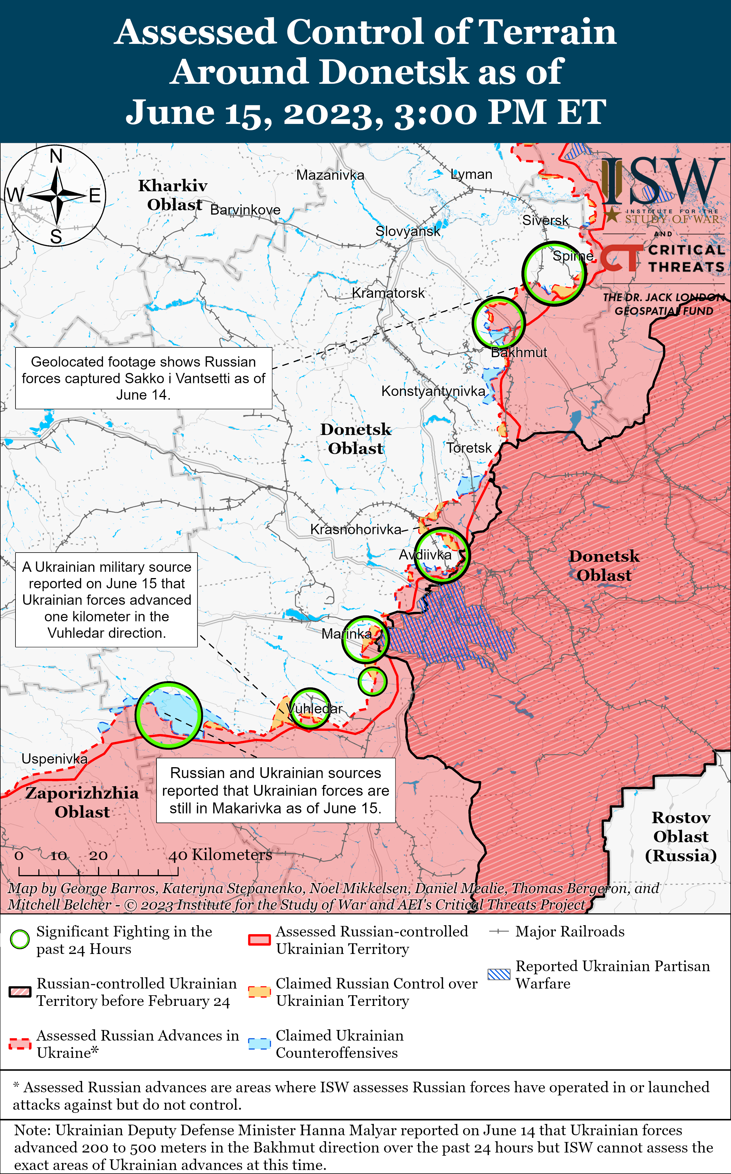 Втім, окупаційні сили РФ продовжували обмежені наземні атаки поблизу Бахмута та завоювали певну територію станом на 15 червня. Геолокаційні кадри показують, що російські війська захопили Сакко і Ванцетті (15 км на північ від Бахмута)