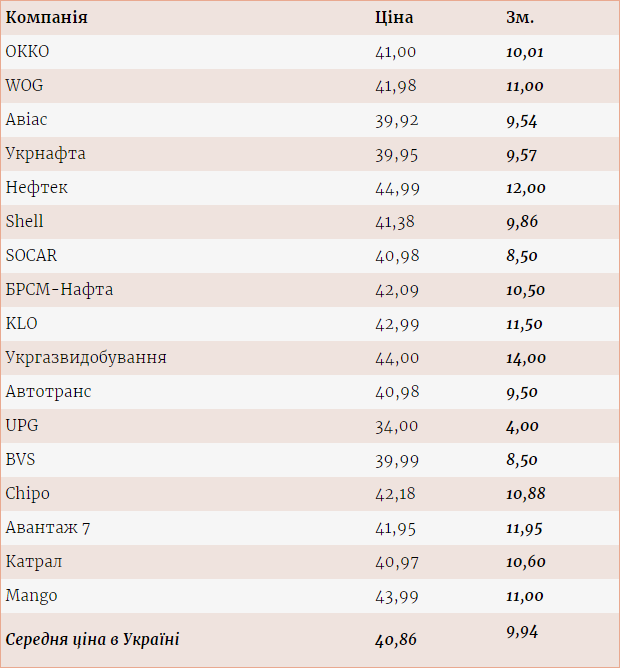 На своїх АЗС мережа "Авантаж 7" виставила на стелу 41,95 грн/л (+11,95 грн/л - до 2 травня). На станціях KLO і SOCAR продукт здорожчав на 11,50 і 8,50 грн/л, до 42,99 і 40,98 грн/л відповідно.