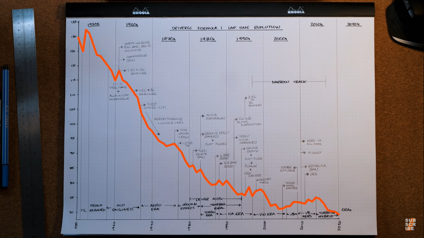 На YouTube-каналі Driver61 розповіли, як покращувався час з роками. Автори відео склали діаграму, в якій врахували найшвидші кола у кожній гонці кожного сезону.