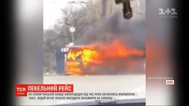 На Солом’янській площі в Києві прямісінько під час руху спочатку задимілась, а потім спалахнула маршрутка. Дим, що валив із моторного відсіку, першим побачив водій. Він встиг вчасно зупинитись і висадити усіх пасажирів на зупинці.