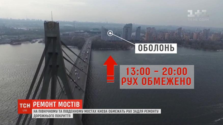 Київські мости - на ремонті. За деякі з них взялися столичні автодорівці. З 10 ранку до 1 години дня дорожники працюватимуть на північному мосту у напрямку лівого берега. Пообіді і аж до 8 вечора візьмуться латати дорогу у зворотному напрямку - в бік Оболоні.