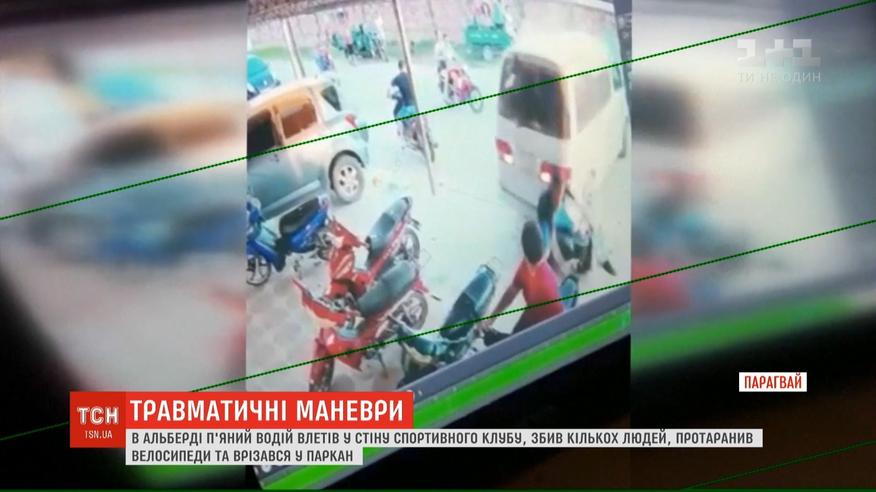 У парагвайському місті водій під час руху назад влетів у стіну спортивного клубу. Фургон збив кілька людей. Автівка також потрощила велосипеди, припарковані поруч із клубом. Після цього водій натиснув на газ - і знову врізався.