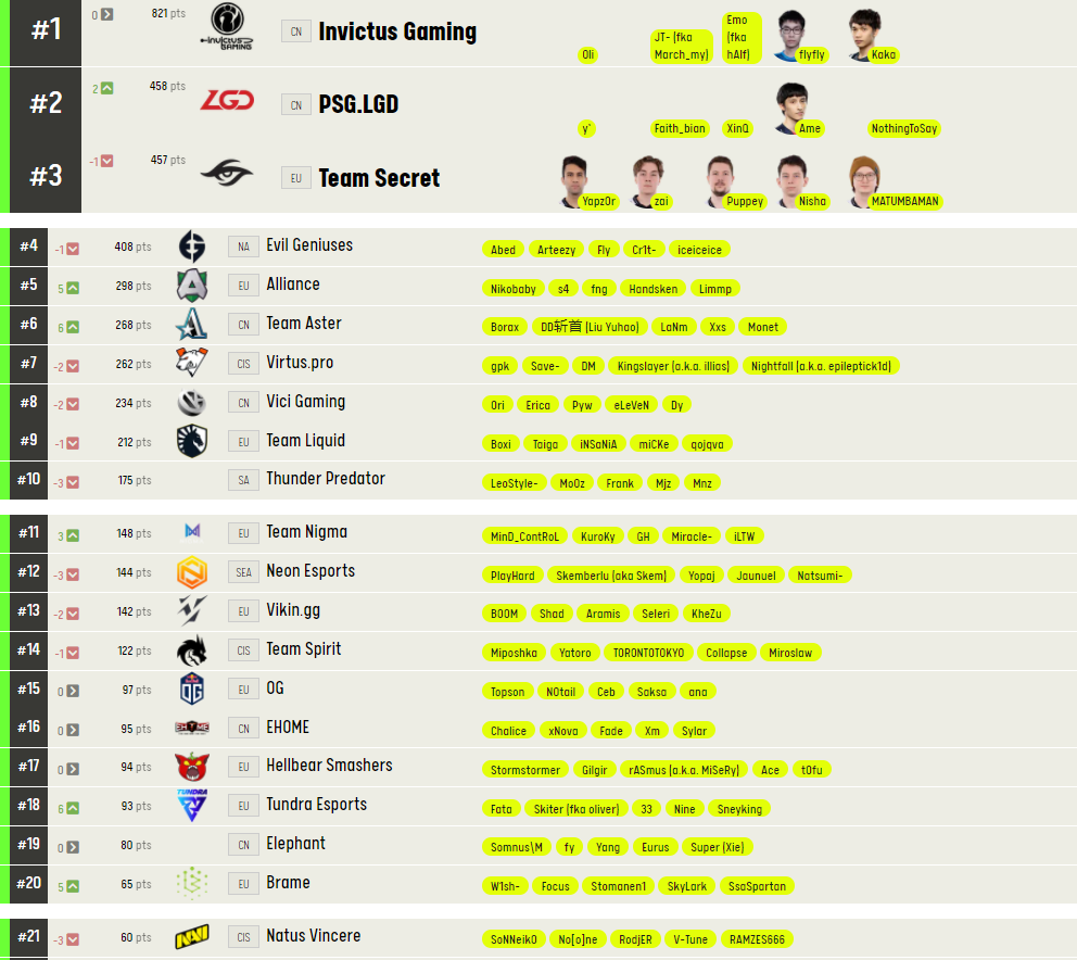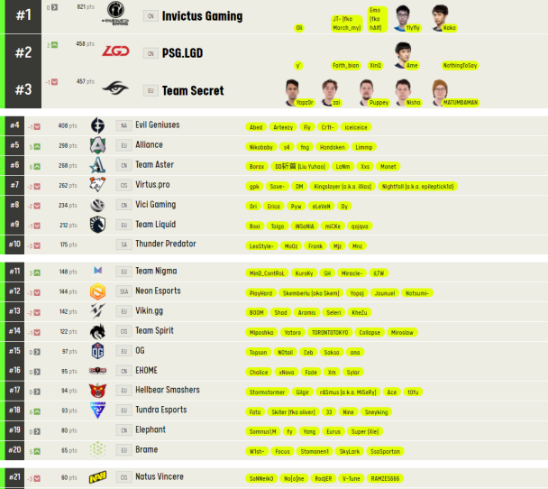 У топ-20 залишилося лише два східноєвропейських колективи – Virtus.pro та Team Spirit, але і вони опустилися нижче. Virtus.pro втратив два місця й опинився на сьомому, а Team Spirit змінив 13 місце на 14.