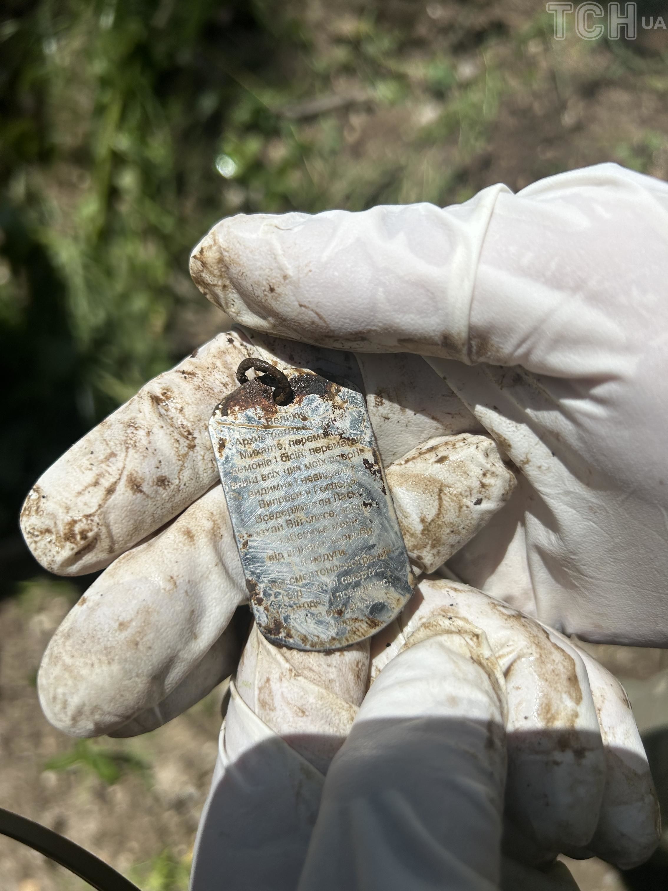Жетон. На зворотньому боці ім’я та прізвище. Жетон належав одному з сімох, але його рештки вдалося ідентифікувати. Нам не кажуть його ім’я, але читають молитву на звороті. Це звернення до Архістратига Михаїла. З проханням зберегти власника цього жетона і знищити всіх його ворогів.