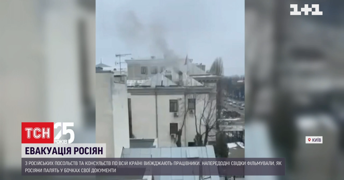 Готуватися до від'їзду в Києві почали ще задовго до заяви російського МЗС. Уже не один раз кияни помічали, як звідти йде дим. Імовірно, там саме спалювали секретні документи. Уперше це зафільмували на відео тиждень тому. Тоді дим ішов серед білого дня, учора - диміло вже пізно ввечері.