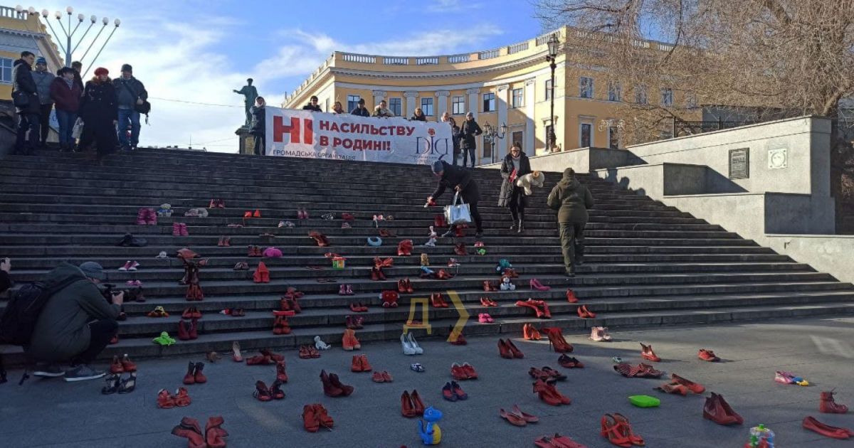 Майже сотня пар взуття та дитячі іграшки з’явилися на Потьомкінських сходах. Принесли і розклали їх жінки та діти, які постраждали чи нині потерпають від домашнього насильства.