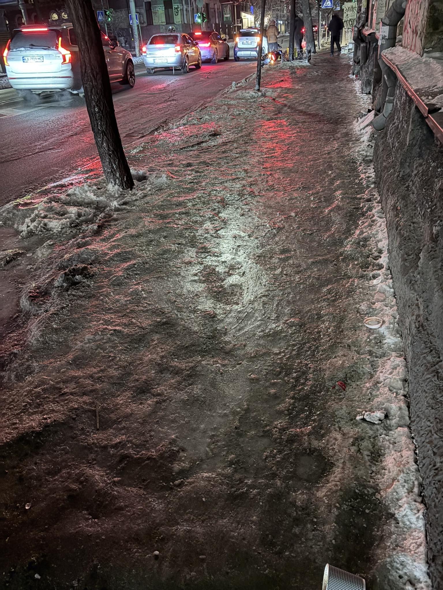 Коли люди врешті оговталися від наслідків ворожого обстрілу і тривалих відключень тепла та світла, у соціальних мережах почали публікувати фото неочищених вулиць та тротуарів. Городяни пишуть, що вдягають на взуття льодостави, які вже почали продавати у підземних переходах. А дехто спеціально посипає тротуар сіллю, коли йде до зупинки транспорту, щоб не травмуватися.