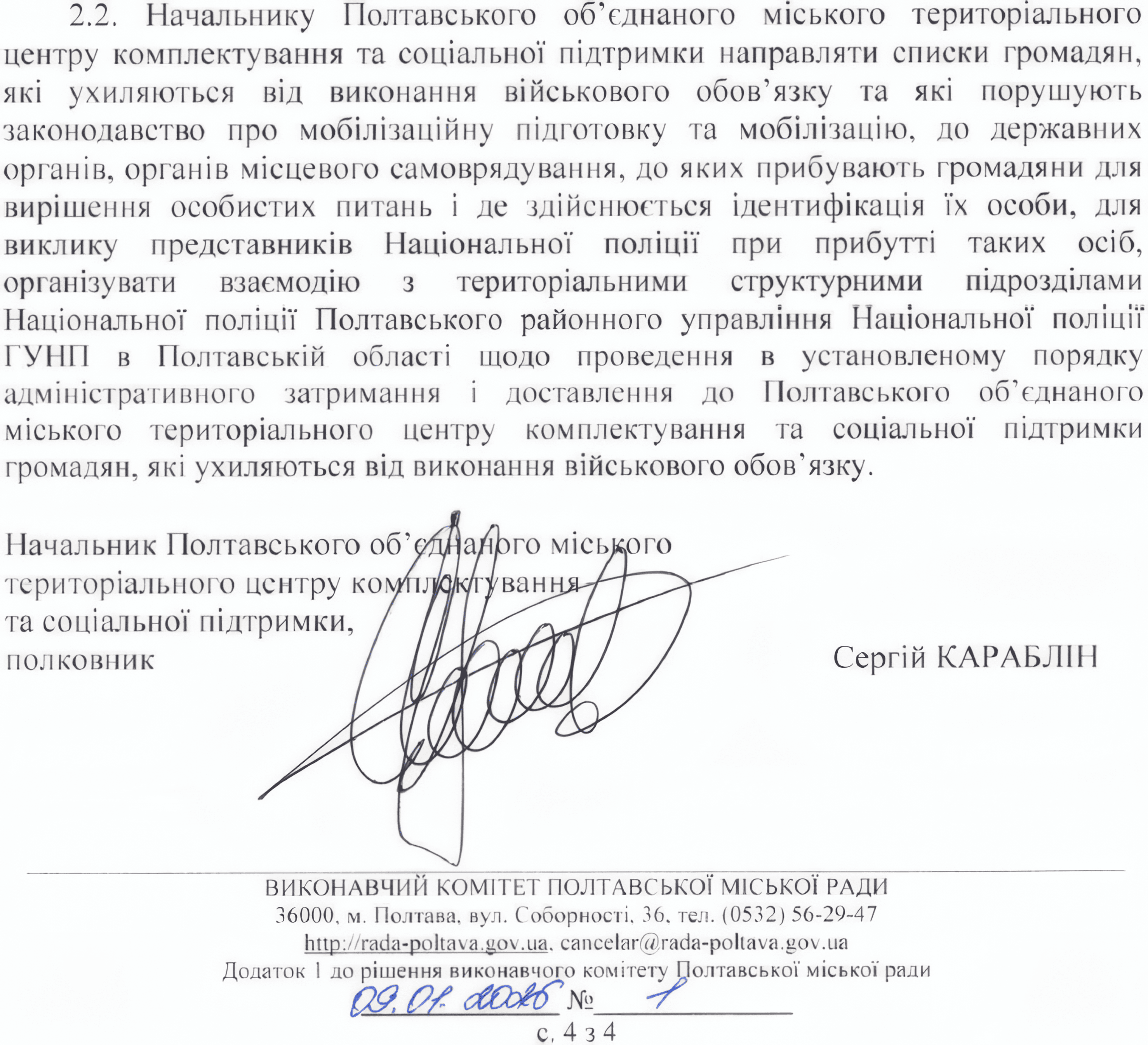 «Так, рішенням виконкому Полтавської міської ради від 09.01.2026 №1 «Про стан військового обліку на території Полтавської міської територіальної громади у 2025 році та завдання щодо його поліпшення у 2026 році» взято до відома інформацію Полтавського ОМТЦК та СП про стан військового обліку на території Полтавської міської територіальної громади у 2025 році та пропозиції щодо його поліпшення у 2026 році, зокрема, пропозиції Полтавського ОМТЦК та СП щодо направлення списків громадян, які ухиляються від виконання військового обов’язку та які порушують законодавство про мобілізаційну підготовку та мобілізацію, до державних органів, органів місцевого самоврядування, до яких прибувають громадяни для вирішення особистих питань і де здійснюється ідентифікація їх особи, для виклику представників Національної поліції при прибутті таких осіб», — повідомила Полтавська міська рада.