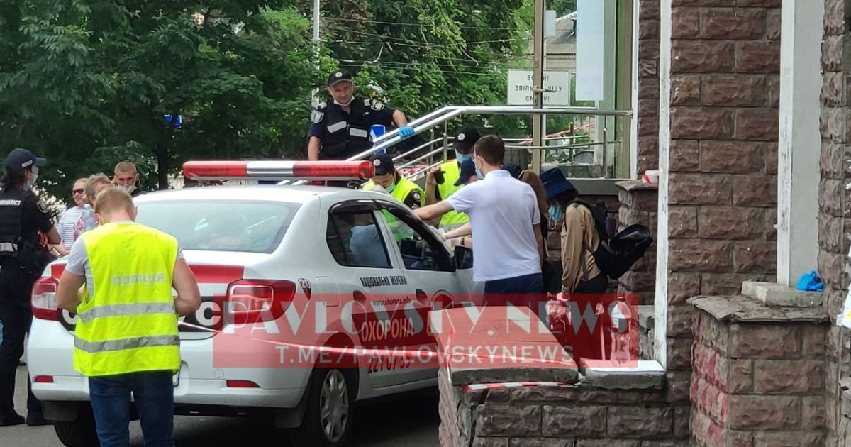 Жінка досі перебуває біля банківського відділення. Вона стоїть нерухомо на одному місці з розстібнутим рюкзаком на спині. На місце вже прибув її адвокат.