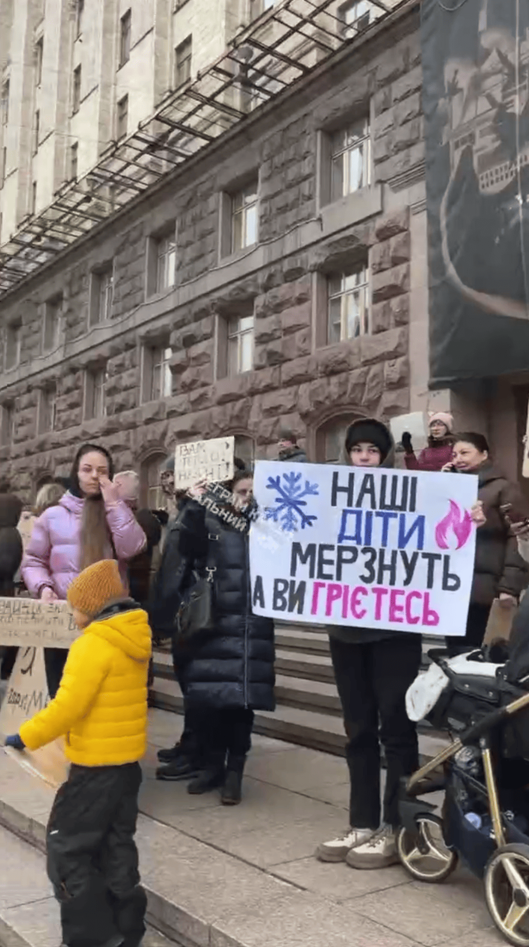 Під стінами Київради зібралися мітингувальники. Під мерію у Києві прийшли жінки з дітьми, які до цього часу живуть у квартирах без опалення. На одному з плакатів можна прочитати: «Наші діти мерзнуть, а ви грієтесь!»