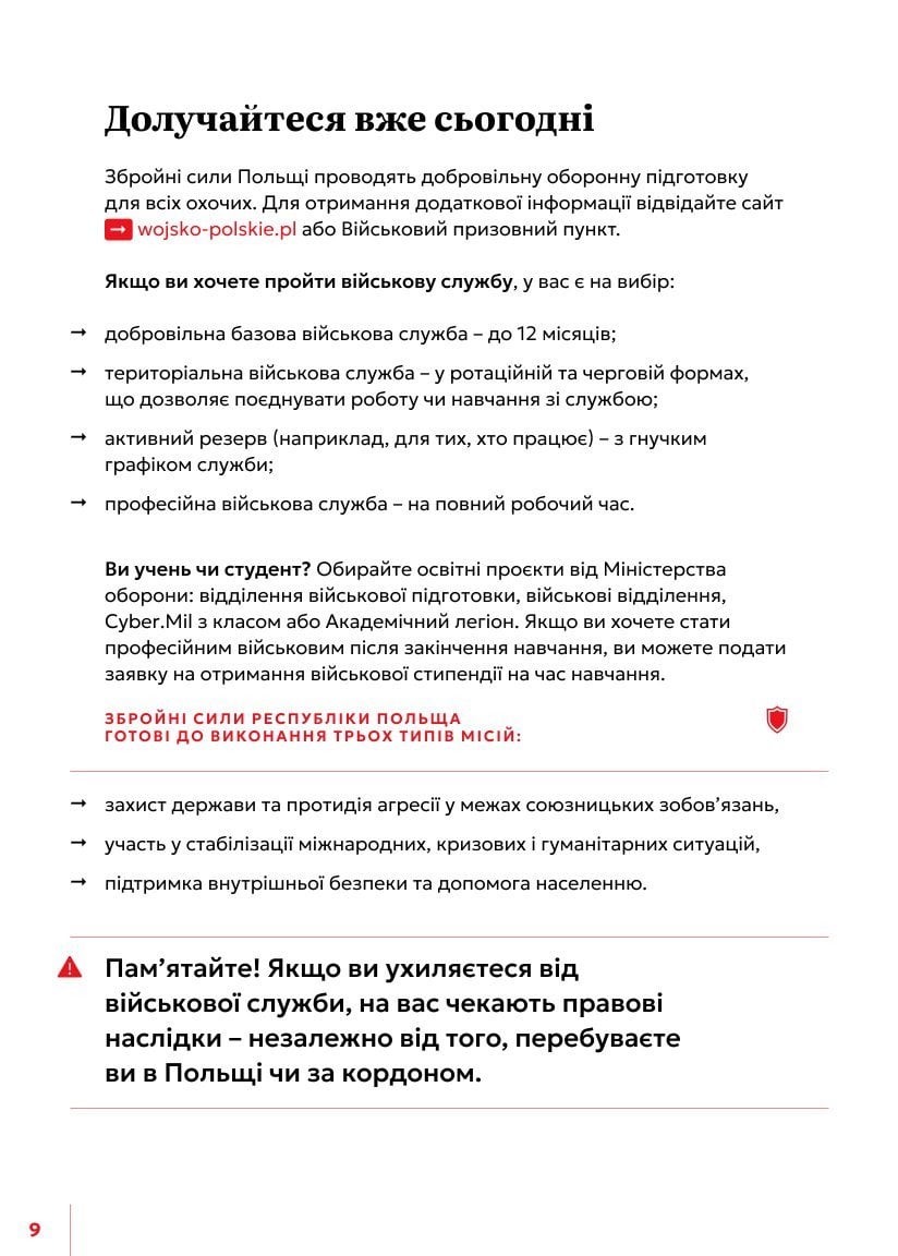 Також на одній зі сторінок повідомляється, що Збройні сили Польщі проводять добровільну оборонну підготовку для всіх охочих. Ще на одній зі сторінок зазначається, що у разі потреби можливе проведення мобілізації, а захист країни є конституційним обов’язком громадян Польщі.