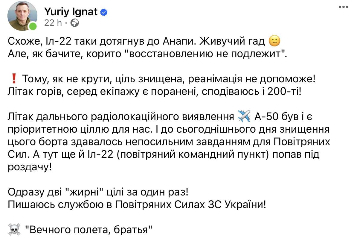 Важкою втратою для рашистів став російський літак А-50. Адже його вартість близько $330 мільйонів, а зробити новий вони вже не зможуть. А ще загинув весь екіпаж. Варто розуміти, що значна частина екіпажу А-50 є вузькоспеціалізованою і повинна пройти кількарічну підготовку.