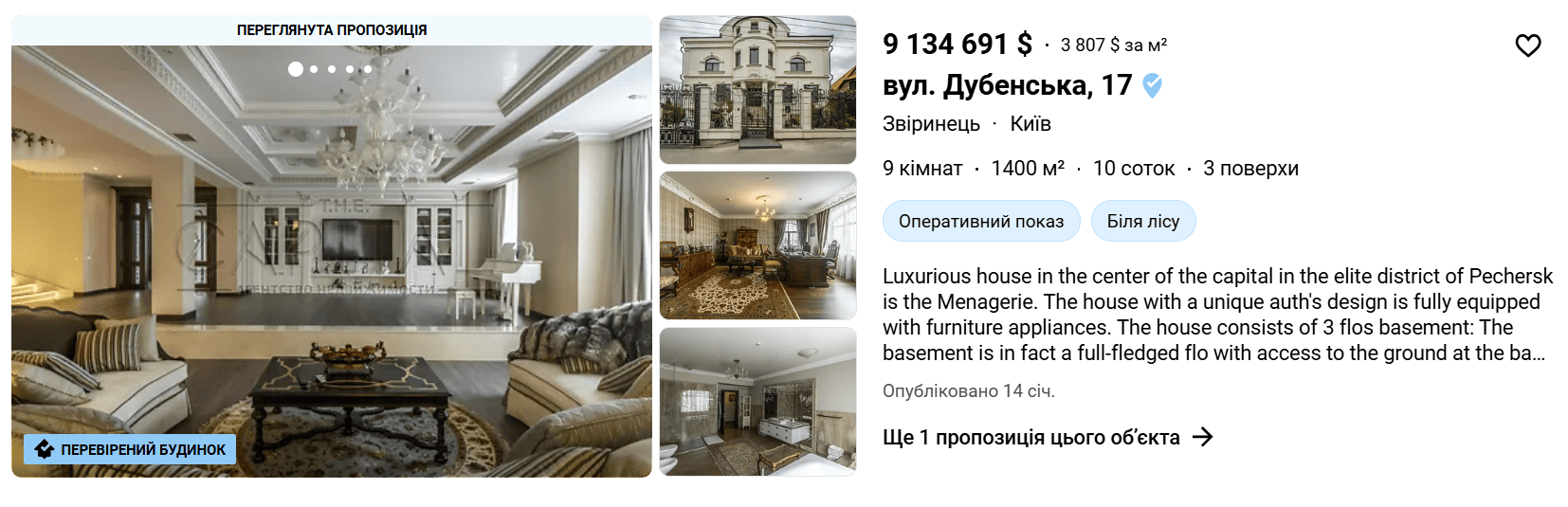 Найдорожче, що пропонують придбати на ринку нерухомості зараз, принаймні у відкритому доступі, це особняк у Печерському районі Києва, мікрорайон Звіринець.