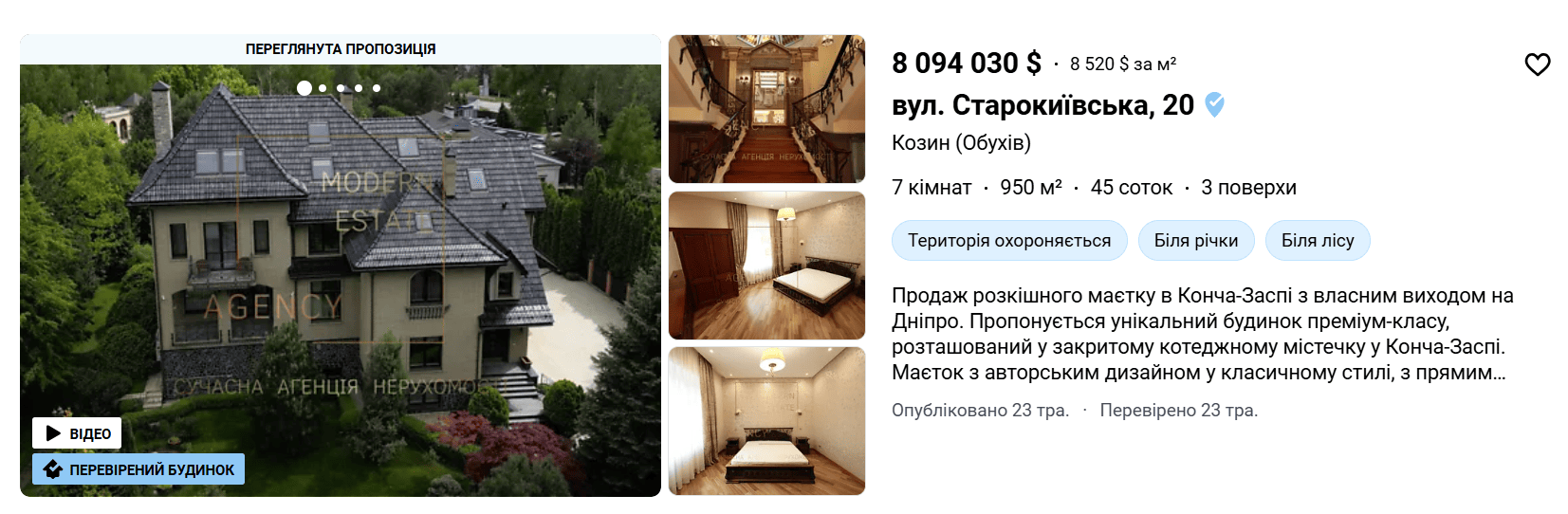 Ще один, найдорожчий будинок, але вже в Київський області, продається у “Конча-Заспі”, село Козин. Він триповерховий, має сім кімнат, загальна площа 950 квадратних метрів. У оголошенні йдеться, що це розкішний маєток преміум-класу з власним виходом на Дніпро, причалом та авторським дизайном у класичному стилі. Ціна — 8 094 030 доларів/344,4 млн гривень. На таке житло українцю з середньою зарплатою доведеться відкладати трохи менше — 13 тисяч років.