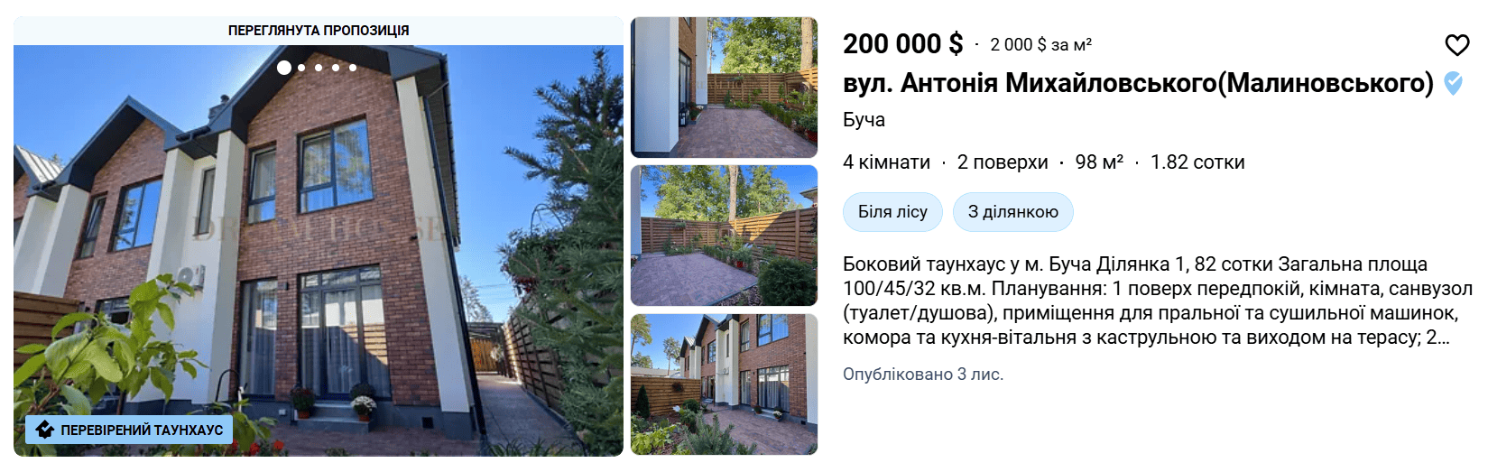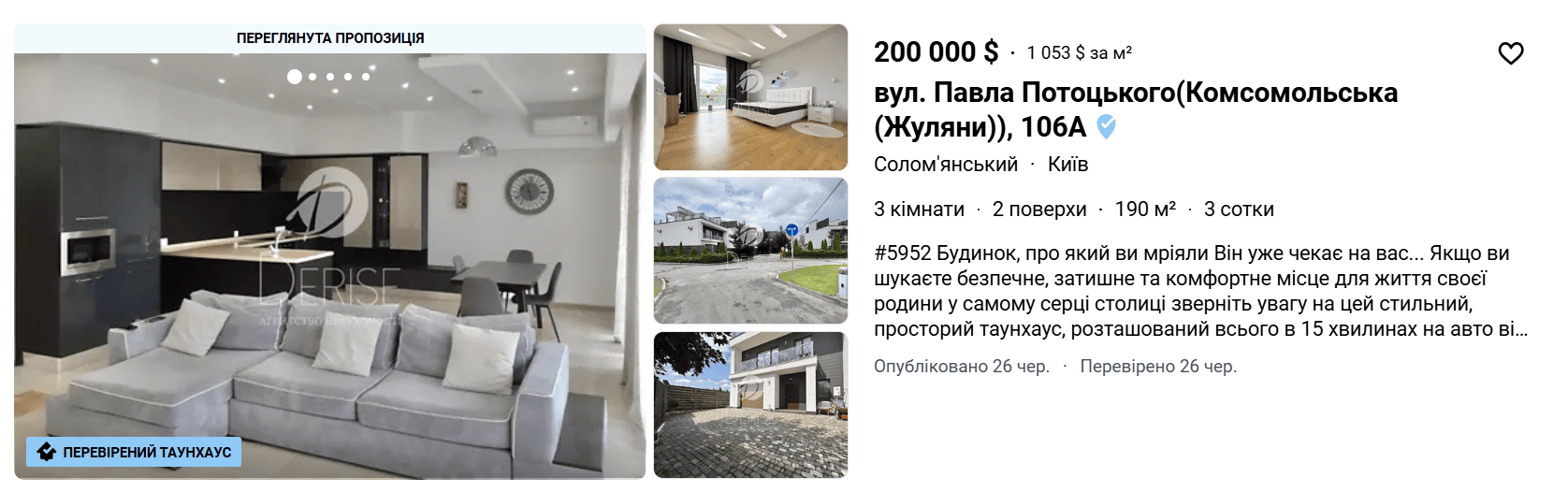 У Києві за такі гроші, наприклад, можна придбати двоповерховий таунхаус з ділянкою на три сотки в Солом’янському районі. Площа будинку — 190 квадратів, тут три кімнати та свіжий ремонт.
