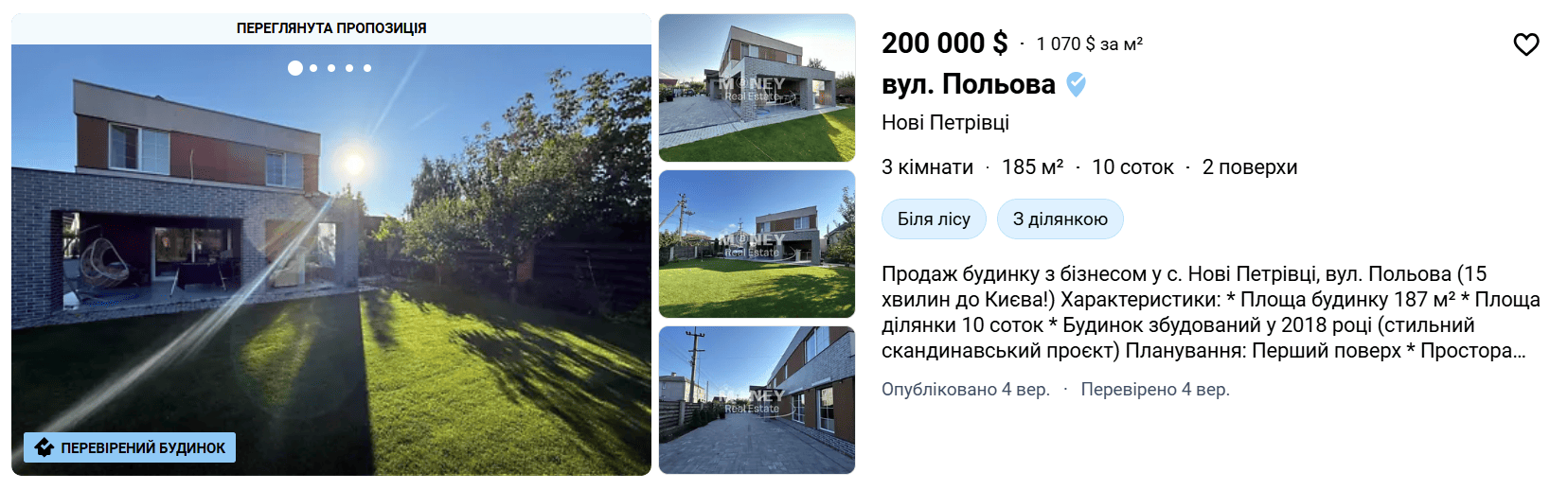 У Нових Петрівцях за 200 тисяч доларів виставлений на продаж двоповерховий будинок із гаражем і ділянкою на 10 соток. Площа будинку 185 квадратних метрів, тут три кімнати та свіжий ремонт. Він укомплектований усіма необхідними для життя меблями та технікою.