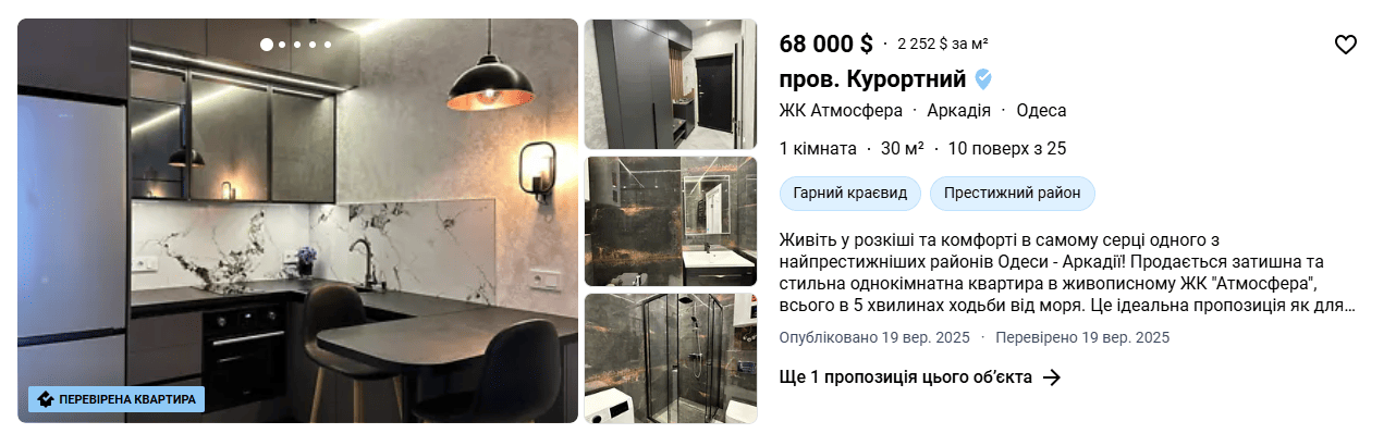 В «Аркадії» або на «Великому Фонтані» ціни на житло комфорт-сегменту формату «заїжджай і живи» починаються від 60 000 доларів — залежно від близькості до моря та якості наповнення квартири.